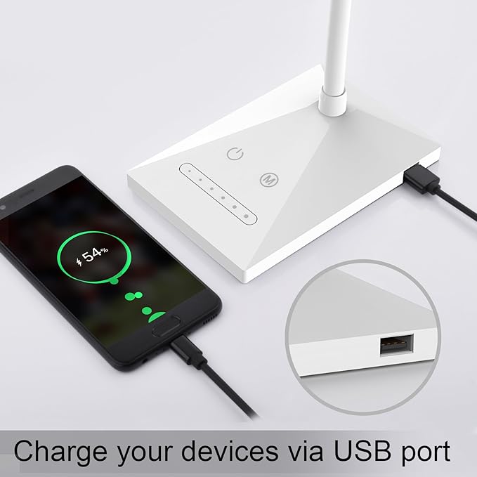 - Built-in USB Charger And Adapter Included: There is a built-in 5V/1A USB output on the side of the table lamp base; You can recharge your smartphone or other USB-compatible devices via the port while lighting, no need to waste other outlet space; Also, the led desk lamp can be powered with the adapter (DC 12V/1A) in the package
