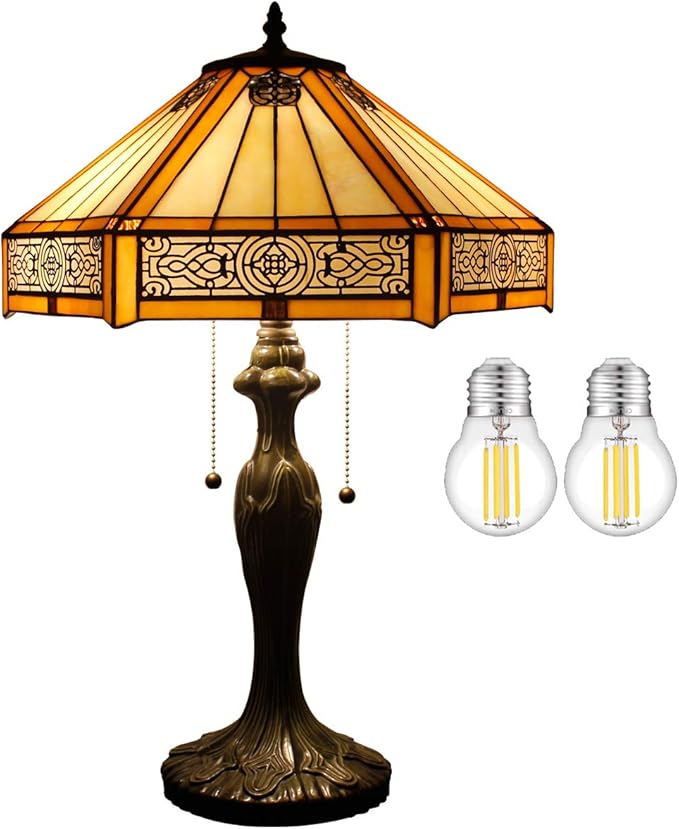 WERFACTORY Tiffany Table Lamp Yellow Hexagon Stained Glass Bedside Lamp Mission 16X16X24 Inches Desk Reading Light Metal Base Decor Bedroom Living Room Home Office S011 Series