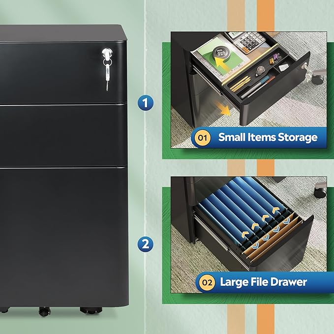 - Modern Design: The modern design of the file cabinet makes it a standout piece in both home and corporate offices. Whether placed beside or underneath a desk, this mobile file cabinet helps you organize your work in a stylish manner. Utilizing full-extension drawer slides, the drawers can fully open, allowing easy access to items at the back.