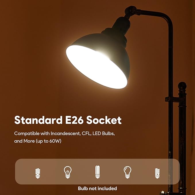 - ETL Certificated: Outstanding quality and unparalleled safety. Compatible with E26 Socket Type (60W Max., LED & CFL compatible, bulb not included). 6-foot power cord for your convenience. Rotary On/Off switch on the lamp head