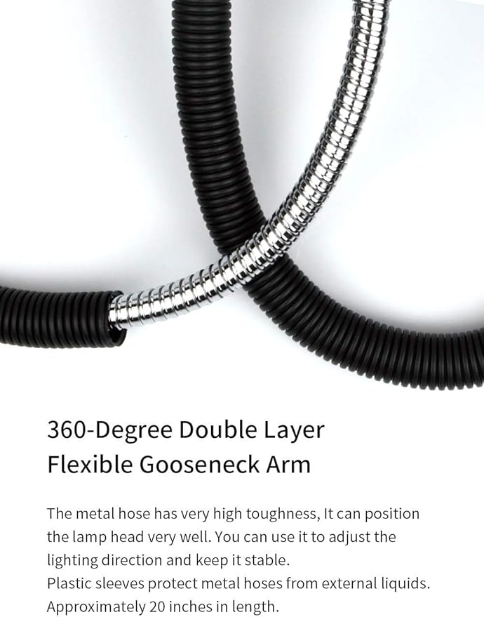 - Double Gooseneck Lamp:The machine light hose is a corrosion-resistant and anti-oxidation double-layer design of outer plastic and inner metal. It is about 20 inches in length and can be bent freely at any angle, facing the place you need
