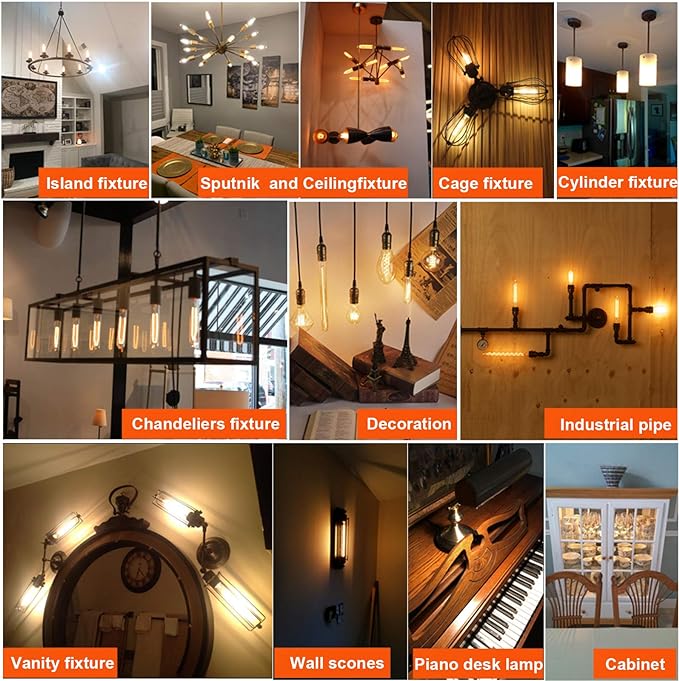 - 【Smooth Dimmable&Skinny&Long】:5Inch long E26 edison bulb is smooth dimming 0%-100%,tested compatible with 95% dimmers,Such as Skylark,Davi,Toggler,Caseta,Maestro,Rotary Preset Dimmer,SAL06P,etc;Narrow retro e26 light bulb suitable for most light fixture with medium E26 socket,especially for fixtures with light bulbs in rustic Pendant,Chandeliers,Sputnik,Island,Wall scones,Vanity,Cabinet,Industrial pipe fixture,piano desk lamp,etc.