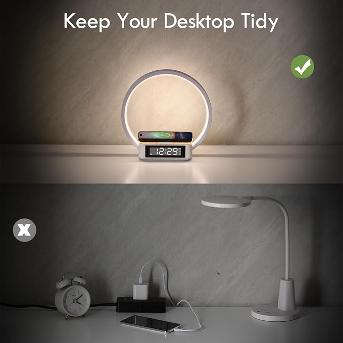 - 【3 IN 1 TOUCH BEDSIDE LAMP】Wireless Charger, Digital Alarm Clock, Nightstand Lamp are integrated into one design. You can use this multifunctional bedside lamp while working, studying, and sleeping, which brings convenience to your life. The small table lamp also saves a lot of space on the desktop.