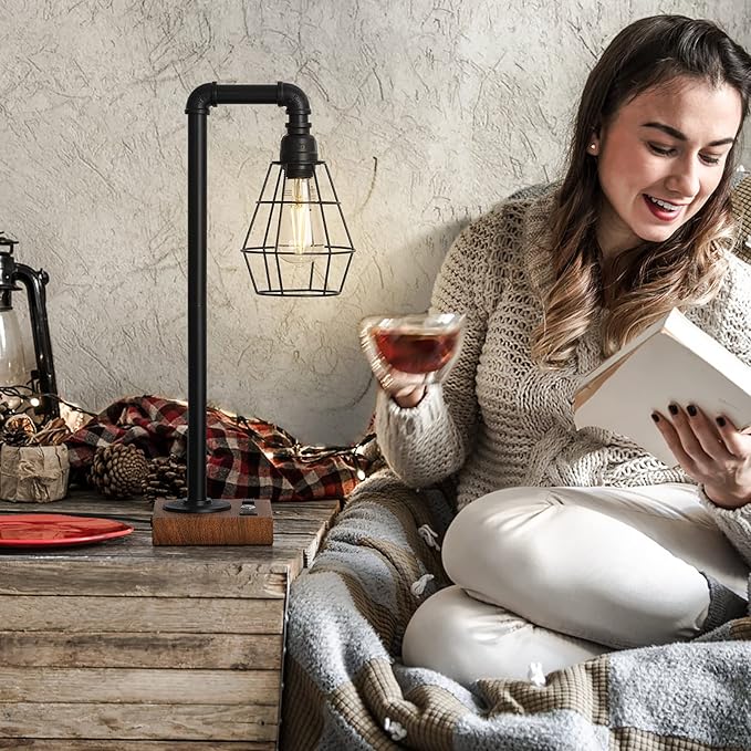 - Industrial Cage Style: Made from wrought iron pipe and metal in a modern black finish, this USB nightstand lamp for bedroom showcases a metal cage-shaped shade perched atop a metal base for mixed-media appeal. Perfect for living room, dining room, den, nursery, study, or office.
