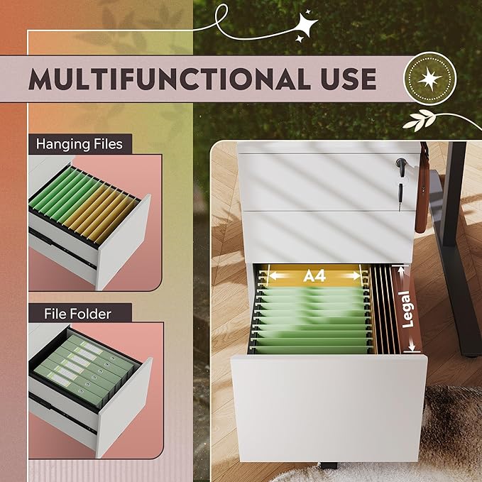 - MAXIMUM STORAGE FUNCTION: Top 2 drawers can accommodate stationery and small items, while 1 full-extension file drawer fits for letter/legal/A4 size hanging file folders, and ensures easy access to files deep inside with smooth ball bearing slides.