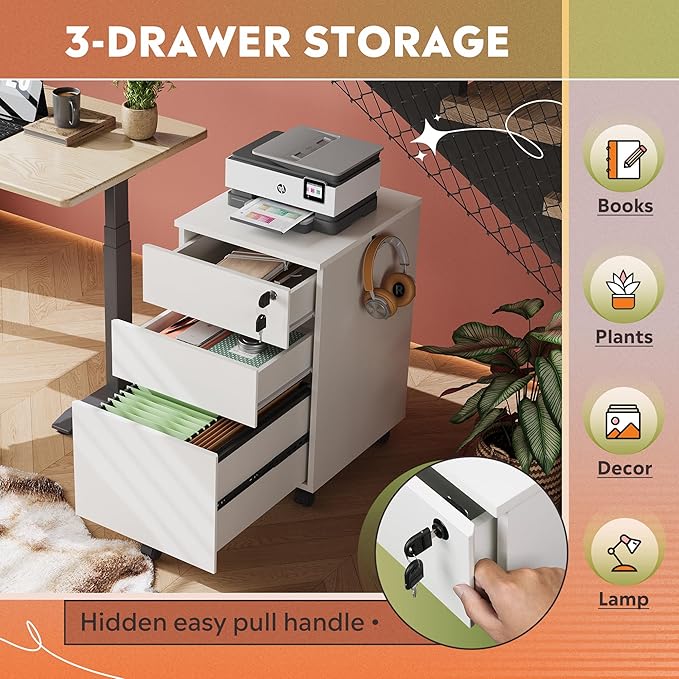 - LOCKABLE FILE CABINET: This 3-drawer file cabinet with 1 lock for first drawer, fits under most desks for home and office, keep your work space organized and neat.