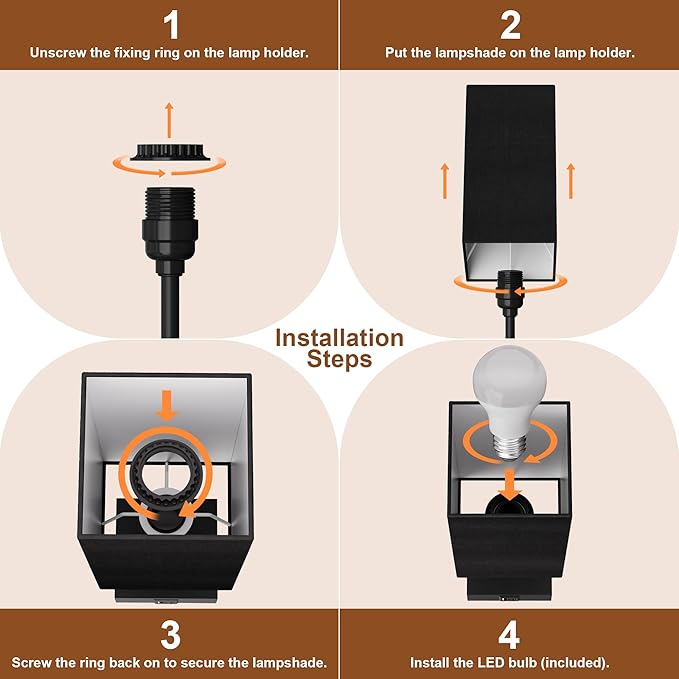 - EASY TO ASSEMBLE: Black nightstand lamp is functional, sturdy, great for small spaces, which enabled you to reduce a lot of clutter on your nightstand. Easy to assemble, here are the installing steps, first: cylinder screw should be screwed on the bottom, second: install lamp shade, third: install ring screw, fourth: install lightbulb.