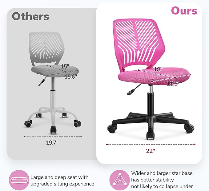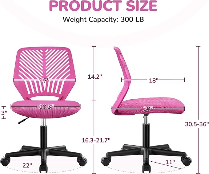 - Modern Design: This ergonomic desk chair is designed with a smart look, clear lining and versatile color make this desk chair great for both office and home. It is in a regularly smaller size but has incredible bearing capacity. Armless design also allows free movement of the body, and it is recommended for customers under 136kg/300lb. Suitable for kids ages 8+.