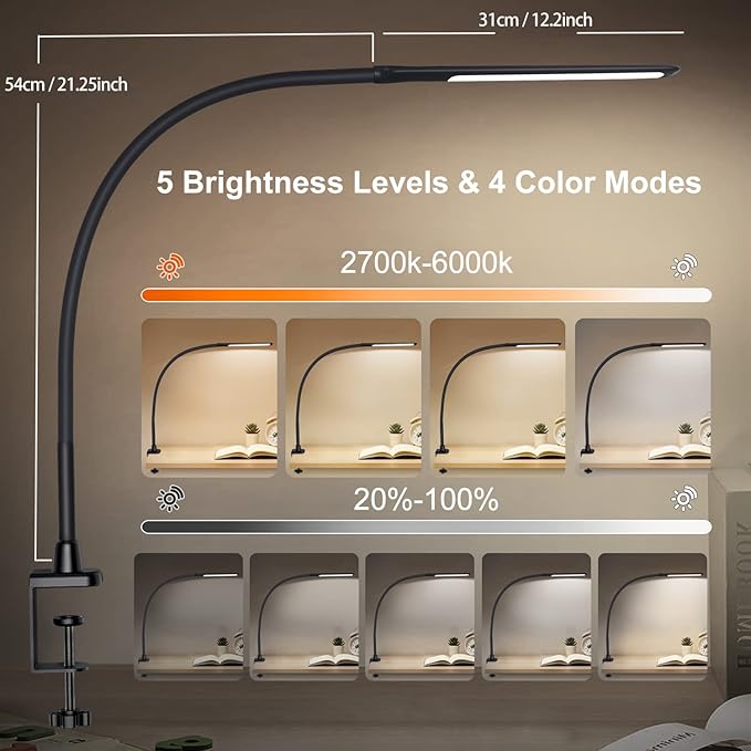 - 【Dimmable & Touch Control Design】Desk lamp with useful touch function is very easy to operate, just touch the button to adjust (2700K-6000K) 4 color temperatures and 5 brightness levels, Allowing you to easily achieve the perfect lighting. Meet the lighting needs of different places.