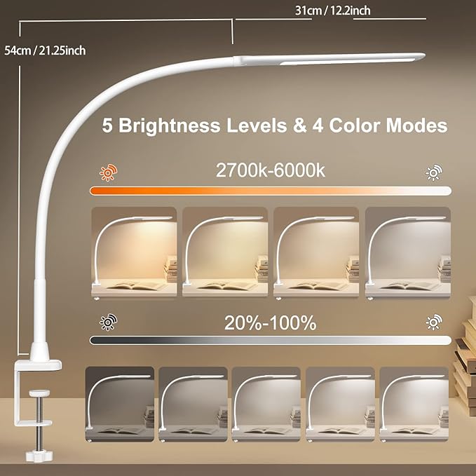 - Dimmable & Touch Control Design: Desk lamp with useful touch function is very easy to operate, just touch the button to adjust (2700K-6000K) 4 color temperatures and 5 brightness levels, Allowing you to easily achieve the perfect lighting. Meet the lighting needs of different places