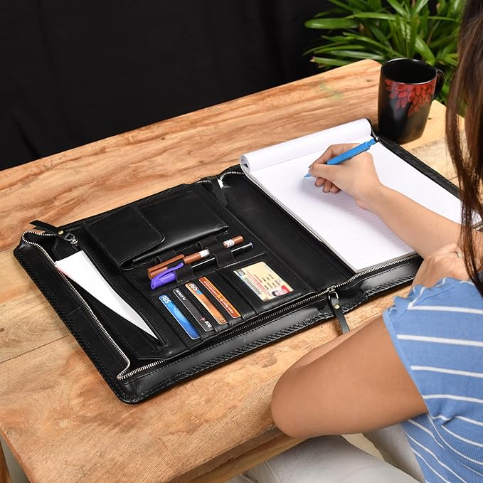 Leather Business Portfolio Padfolio Document Organizer with Writing Pad Resume Professional Interview Zipper Writing Notepad Folder for Men Women (Black)