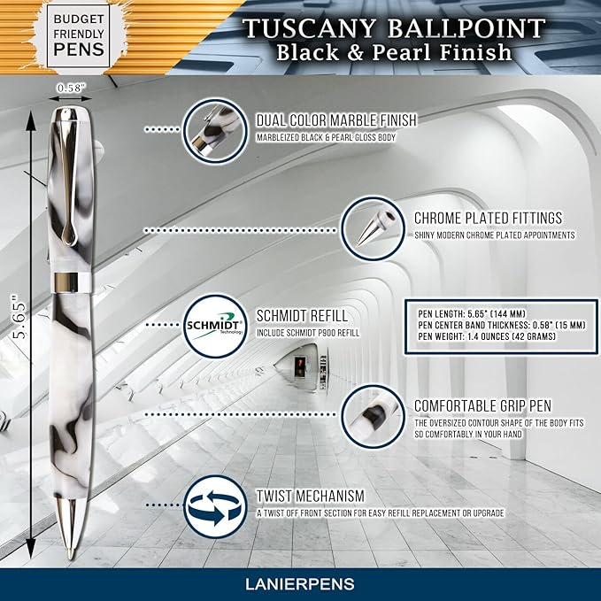 - Pen Color: Black & Pearl, Resin Body, Chrome Accents, Pocket Clip, German-made Stainless Steel Medium Tip, Dual Color Marble Finish - Marbleized Black & Pearl Gloss Body, Chrome Plated Fittings - Shiny Modern Chrome Plated Appointments, Schmidt Refill - Include Schmidt P900 Refill, Comfortable Grip Pen - The oversized contour shape of the body fits so comfortably in your hand, Twist Mechanism - A Twist off front section for easy refill replacement or upgrade.