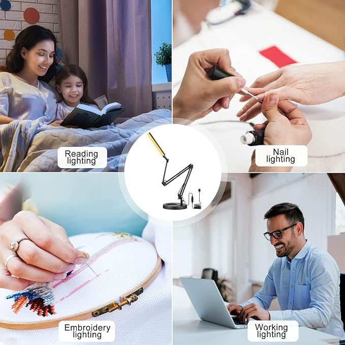 - 【Long Sewing 3 Arms Desk Lamp】The ultra-long sewing arm desk lamp can be adjusted to the position you want at will, and will not affect your work as the arm is too short. The arm length is: 9.8"+13"+13"/25cm+33cm+33cm. The desk lamp for home comes with a 360° rotating light, 360°rotating base,180° adjustable metal arm. You can adjust the light direction as you like