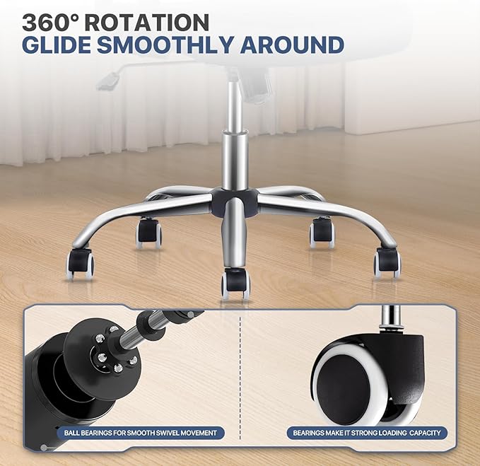 - Sturdy Construction- Re-engineer hydraulics and heavy-duty metal base provides up to 250 lbs weight capacity. Rolling Swivel Chair has ultra-quiet and anti-scratch 360° swivel smooth-rolling PU casters, which provide freedom of movement in the office.