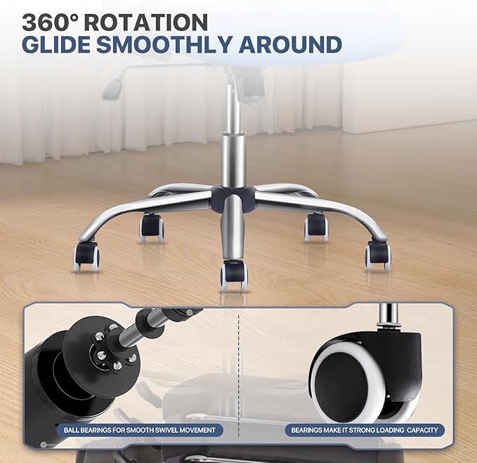 - Sturdy Construction- Re-engineer hydraulics and heavy-duty metal base provides up to 250 lbs weight capacity. Rolling Swivel Chair has ultra-quiet and anti-scratch 360° swivel smooth-rolling PU casters, which provide freedom of movement in the office.
