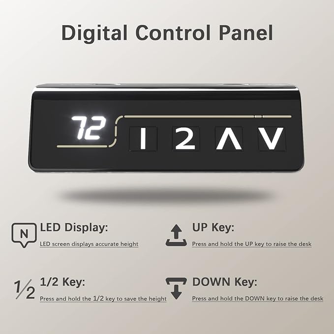 - 【Memor Electric Lift】Compared with the ordinary office desk, this standing desk can easily control the height using buttons, so that it can be used by people of different heights in different scenes. The design of 1/2 memory keys allows it to be adjusted quickly and accurately to your preset comfortable height. The motor system also includes safety lock function, anti-collision function and overheat protection function.