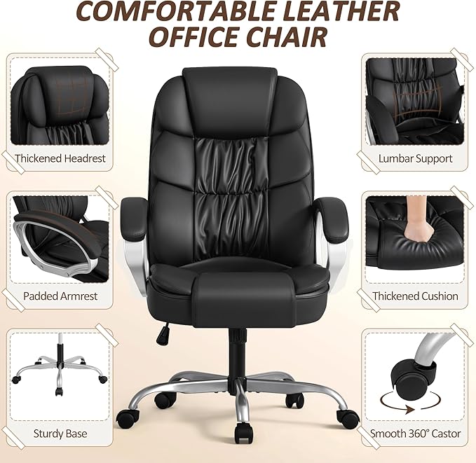- PU Leather Office Chair: Designed for both work and relaxation, this executive office chair is upholstered in premium soft PU leather and features a double-padded seat for cloud-like comfort. The padded armrests and a 300 lb weight capacity ensure durability and long-lasting support, helping you stay comfortable and productive for hours