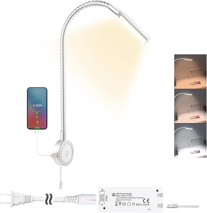 - 💡 【Flexible Gooseneck & Touch Control】The wall-mounted Reading Light Gooseneck head can rotate 360°, allowing it to be adjusted and directed lighting, providing flexibility and convenience.With touch dimmer switch and two timers, this wall-mounted reading lamp offers easy control.