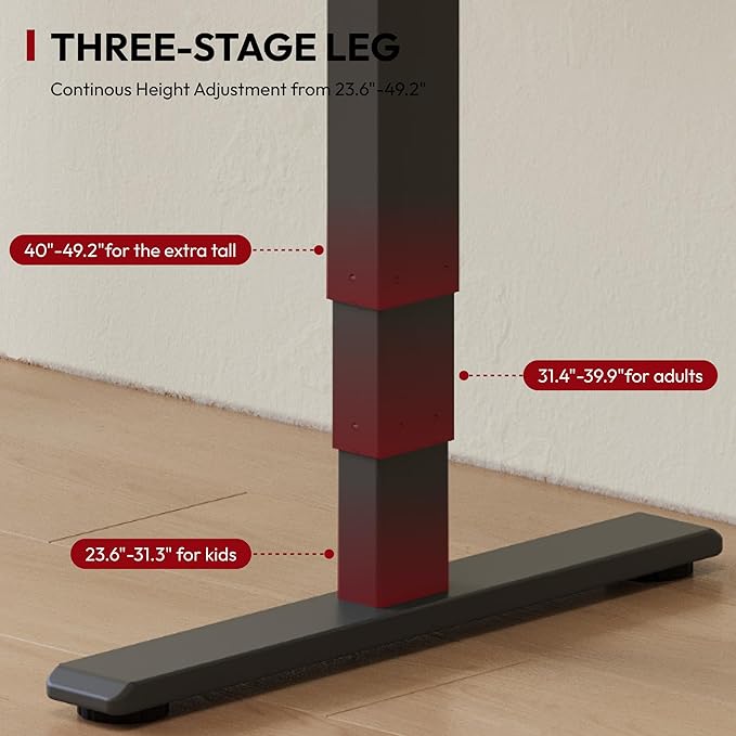 - Adjustable 3-Stage Lifting System for Varied Heights:The 3-stage inverted lifting column provides a discreet and stable lift.Boasts a height range from 23.6” to 49.2”, effortlessly adapting to various height requirements.Enables users to freely switch between standing and sitting positions.