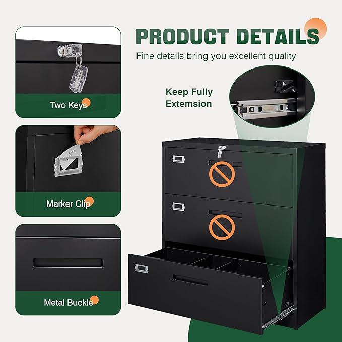 Letaya Lateral 3 Drawer File Cabinets with Lock, Metal Filing Storage Vertical Cabinets,Home Office Furniture for Organization Hanging Letter/Legal/F4/A4(Black)