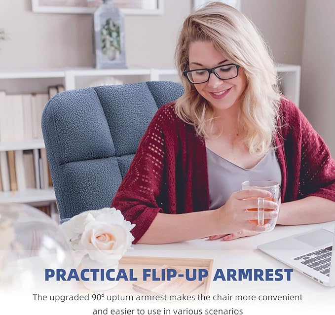 SEATZONE Blue Office Chair with Wheels,Ergonomic Home Office Computer Chair with Flip-up Armrest,Comfy Adjustable Rolling Chair Teddy Fleece