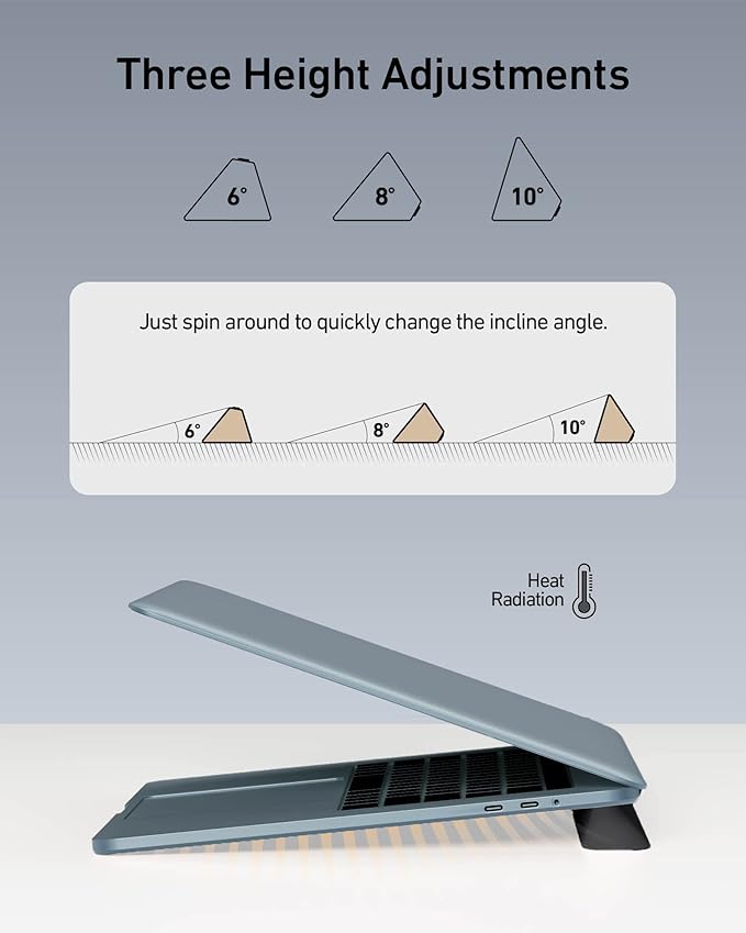 - ใThree Ergonomic Anglesใ Available in incline levels 6ยฐ, 8ยฐ, and 10ยฐ, which are rational heights for reading and typing, this laptop cooling stand can alleviate posture-related problems such as muscle, wrist, and repetitive strain injury.