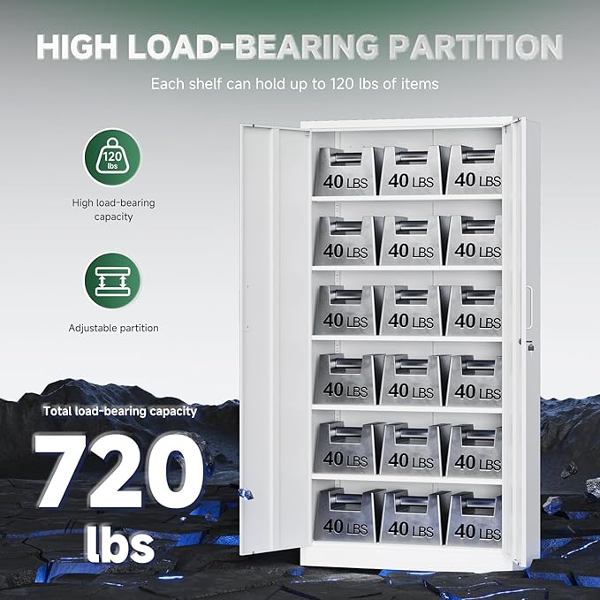 - Large Storage Space: Steel storage cabinets H72 * W36 * D18 inch , features 5 adjustable shelves, 6 floors in total, shelves can hold up to 180 lbs, which is very suitable for storing office documents supplies, garage tools or other large and heavy household items, ideal for long-term to use. 71-inch counter height perfect for use in homes, offices, garages, schools, shops, warehouses or other commercial spaces