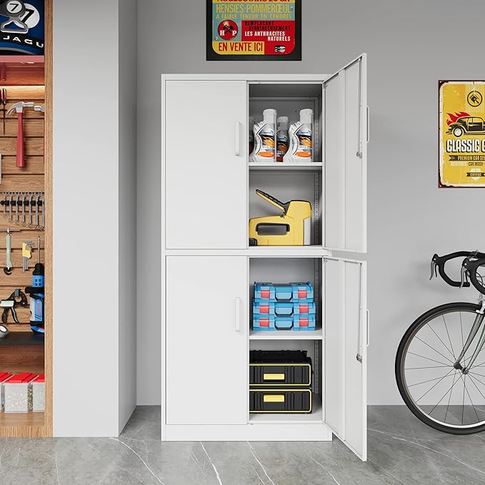 STANI Metal Storage Cabinet, Locking Steel Cabinet With 4 Doors and 2 Adjustable Shelves, 71" Lockable File Cabinet for Home Office, Garage, School (White)