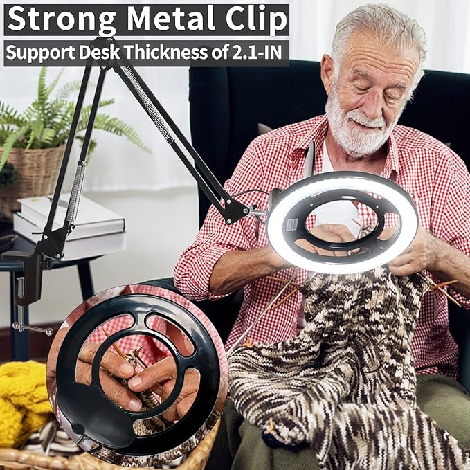 - Flexible and firm arm: Our table lamp with strong metal clip, which can support a desk thickness of 2.1-inch and very firm. The clamp light is also equipped with a silicone pad to avoid scratching the desk. The clip hole is equipped with a rubber stopper to prevent scratching the lamp arm. metal swing arm can 180° adjusted and extended to 40.5 inch of height to provide multi-directional lighting. You can position the magnifying glass anywhere, free your hands and enjoy your hobbies.
