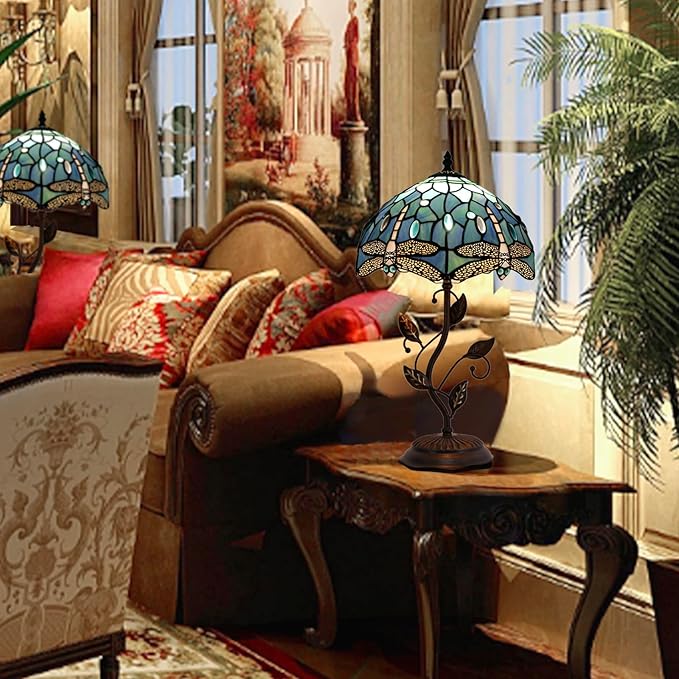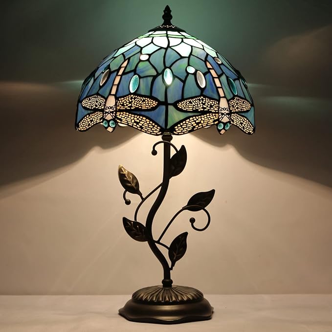 Tiffany Lamp Blue Dragonfly Style Stained Glass Table Lamp Desk Bedside Reading Light 12X12X19 Inches with Metal Leaf Base Decor Bedroom Living Room