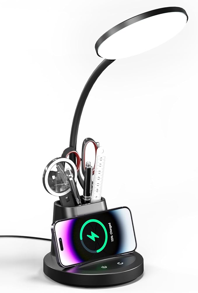Desk Lamp with Wireless Charger, LED Desk Lamp for Home Office with Pen Holder, Dimmable Eye-Caring Study Desk Light Flexible Arm 3 Color Modes for College Dorm, 800 Lumens CRI 90