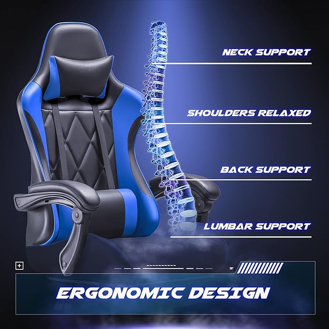 - Excellent Comfort: This computer gaming chair features headrest and massage lumbar pillow. When your neck gets sore from long hours working or gaming, the headrest can help ease the pain. When your waist feels achy from sitting in a same position, open the massage function of the lumbar support and let it relieve your fatigue.