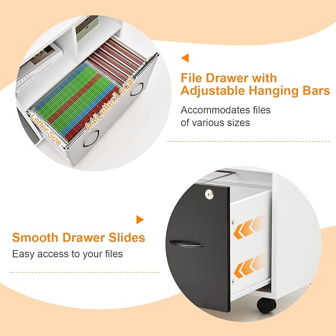 - Large Drawer with Lock: Our this file cabinet is equipped with adjustable hanging bars, the drawer accommodates files of various sizes including legal/letter/A4. The smooth drawer slides offer easy access to your files. Moreover, the drawer comes with a lock & keys to add more security to your important files or items.