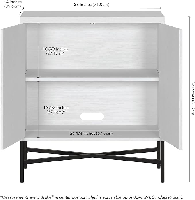 - Features two textured PVC swing-out doors, adjustable center shelf, and a cable management cut-out.