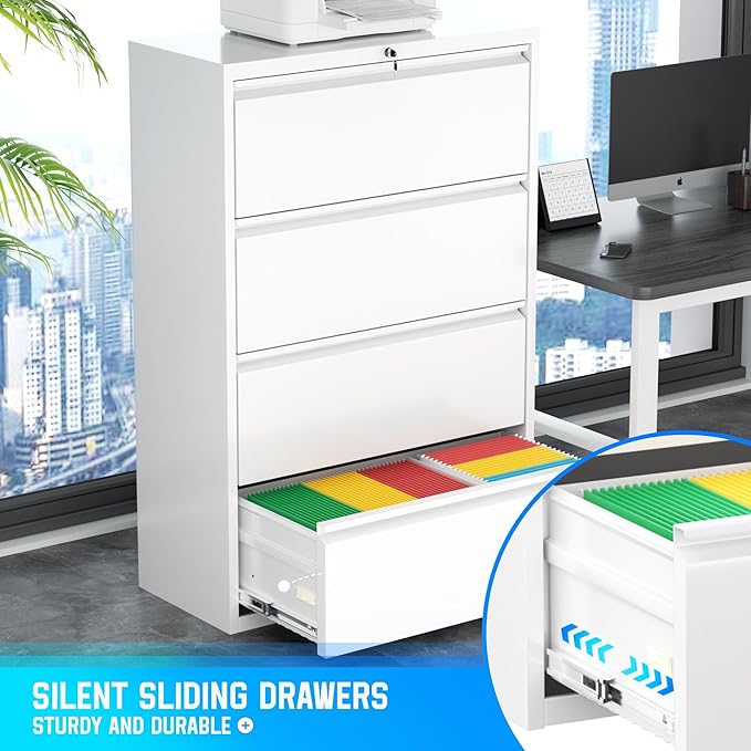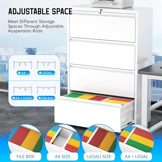 - 🗄️【Higher Security Locking System】The white wide filing cabinet comes with one lock and two keys. The metal file storage cabinets uses newly upgraded interlock system can lock all drawers with one lock, bringing more advanced security. Four drawers white filing cabinets to better protect the safety of your valuables and confidential documents.