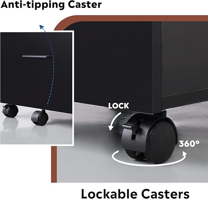 - 【Easy to Move】 Equipped with five 360° swivel wheels, including 2 front lockable wheels and 1 anti-tip wheel for stability. Move your filing cabinets anywhere you like without worrying about it tipping over.
