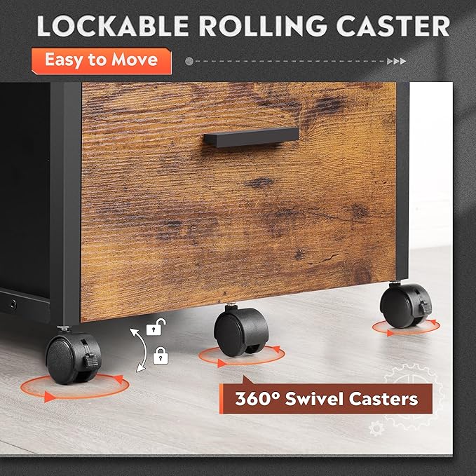 - Easy to Move: The rolling file cabinet has 5 wheels, so it can fix or move around your home office freely. Built-in brakes on front 2 casters to keep the filing cabinet in position and add stability. The bottom drawer with a caster under it that can prevent tipping.