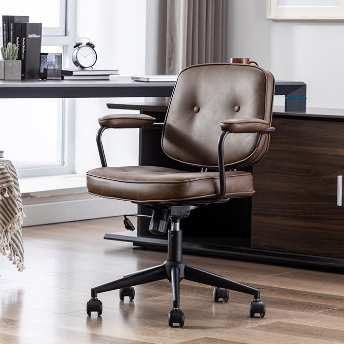 LukeAlon Adjustable Pu Leather Home Office Chair, Comfy 360° Swivel Task Chair with Armrest Modern Thickened Seat Desk Chair Tiltable Computer Chair with Buttons & Wheels, Brown