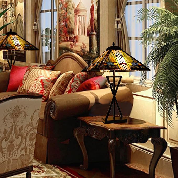 - Lamp Information: The Mission Tiffany lamp total height 25 inch (63 cm), The square lampshade each side width 16 inches (40 cm), Pull Chain Switch on 2 Light with UL listed, Iron base black finished , simple assembly.