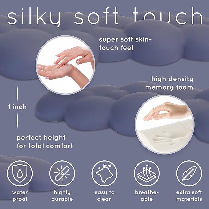 - Cloud Soft Comfort – The new slate blue cloud wrist rest by Create-ables prioritizes comfort and quality. The outer material of the cloud mouse pad with wrist rest is milk-silk – a soft, luxurious and biodegradable fabric that is similar in texture to silk and cashmere. Milk-silk is skin-friendly (unlike PU leather made from oil and chemicals) and more durable than most other fabrics