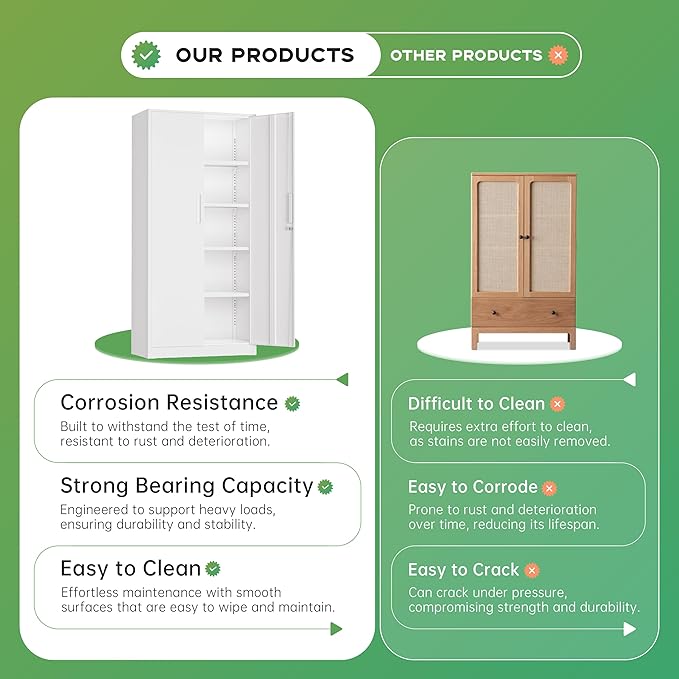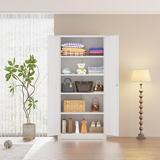 - 【pratical design】Our tall metal cabinet equipped with 4 adjustable shelves to provide adaptability and convenience.Regardless of what your storage needs are, you have the ability to create a unique storage space to suit them.