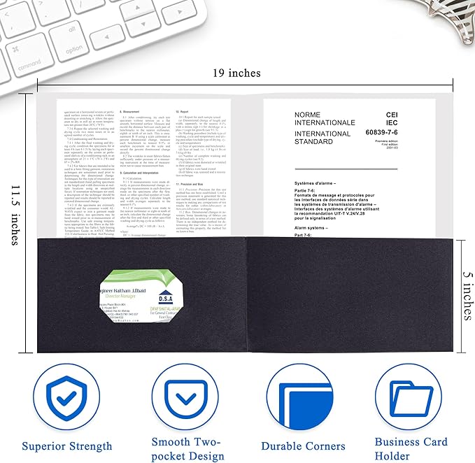 - Professional Design:Two pockets provide storage space for paper,brochures,and more,Each folders for documents measures 9" x 11.5",with two 5" pockets,holds (over 100) sheets of paper,and has a universal business card holder on the right pocket.