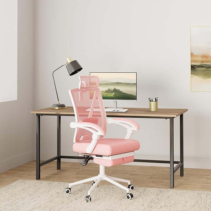 Misolant Ergonomic Office Chair with Footrest, Pink Desk Chair with Adjustable 2D Lumbar Support, High Back Mesh Ergonomic Office Chairs with Adjustable Headrest and Linkage Armrest