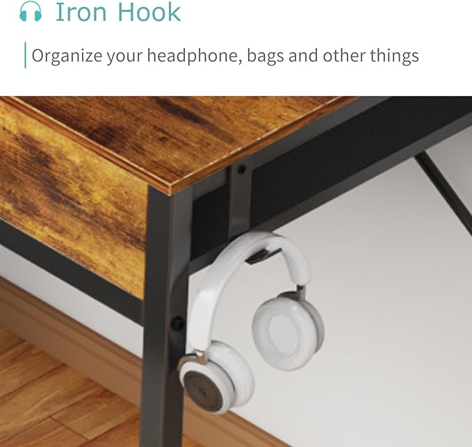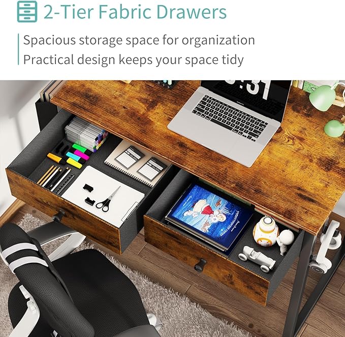 - Vintage Style Design: Computer desk with 2-tier fabric open drawers with wooden front for storage, providing plenty of room for under-desk storage and organization. This desk is made of thick P2 particle wood board with scratch-resistant, anti-collision and waterproof, protect home office desk surface from daily wear and tear.