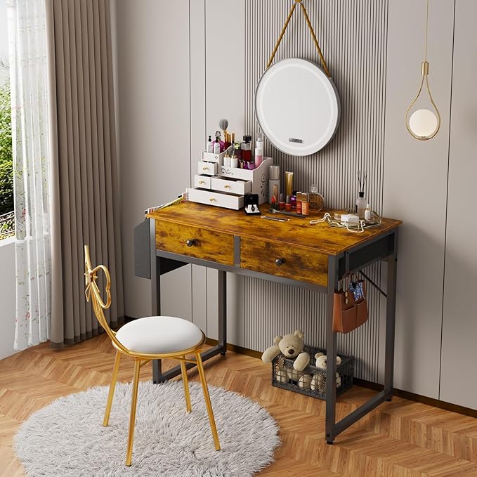 Lufeiya Small Computer Desk with 2 Drawers for Bedroom, 31 Inch Home Office Desk with Storage Fabric Drawer and Bag, Study Writing Table for Small Spaces, Rustic Brown