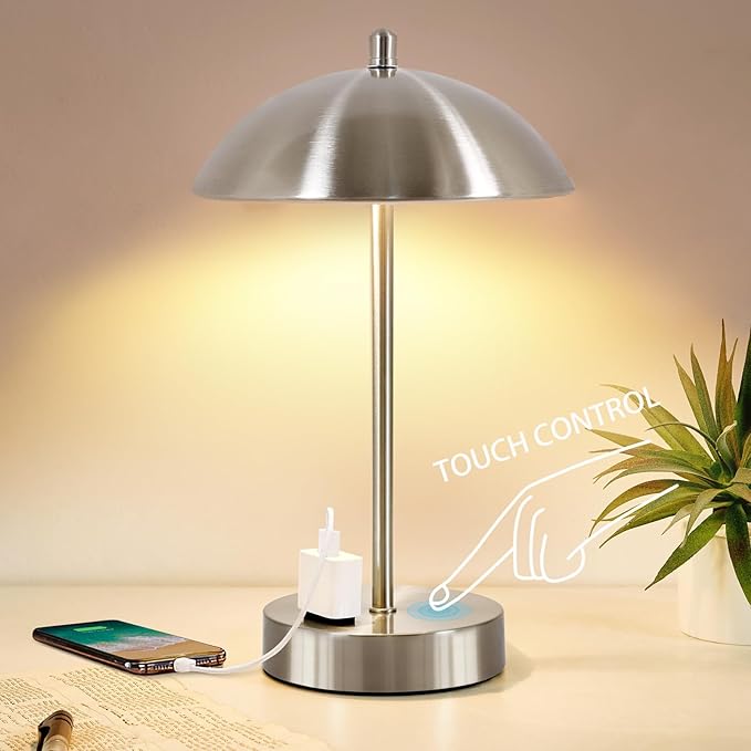 Modern Desk Lamp with AC Adapter,12" 3-Way Dimmable Touch Bedside Reading Lamp, Minimalist Silver Small Nightstand Table Lamp with Mushroom Dome Shade for Bedroom Living Room Office, LED Bulb Included