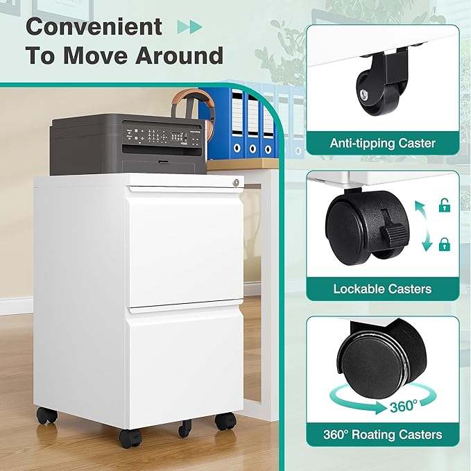 - MOBILE DESIGN: 2 drawer metal file cabinet with lock equipped with 360-degree rotating wheels and lockable casters for smooth mobility,one center caster to prevent tipping,perfect for under-desk storage or moving between workspaces
