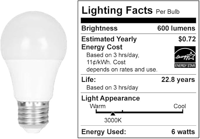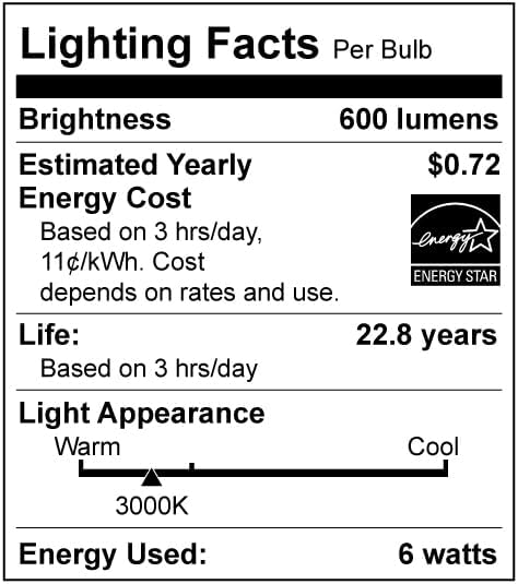 - ✔️【Lighting Facts】-Equipped with a 6W LED bulb providing 600 lumens of light, 3000k Warm light ensures a warm and inviting ambiance. Estimated to cost $0.72 per year based on 5 hours of daily use, Based on 3 hrs/day, It can be used for 22 years.