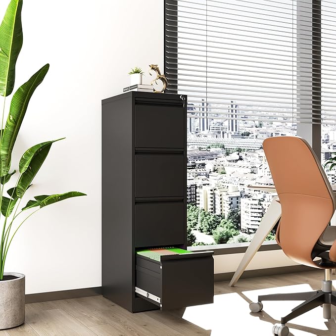 - 【Large capacity】This 4 drawer black file cabinet offers spacious storage with larger and deeper drawers for letters size folders, drawer with lock is equipped with adjustable hanging rails, allowing you to customize the organization of your files