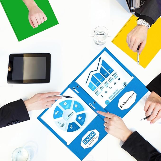 - TWO POCKET FOLDER SET: RAZCC paper file folders with 2 inner pocket, 3 prongs and 2 business card slots. 75 Pack in off - green, cyan, orange, yellow and magenta, color-code your notes or documents in these specific colors to keep them organized by subject or project